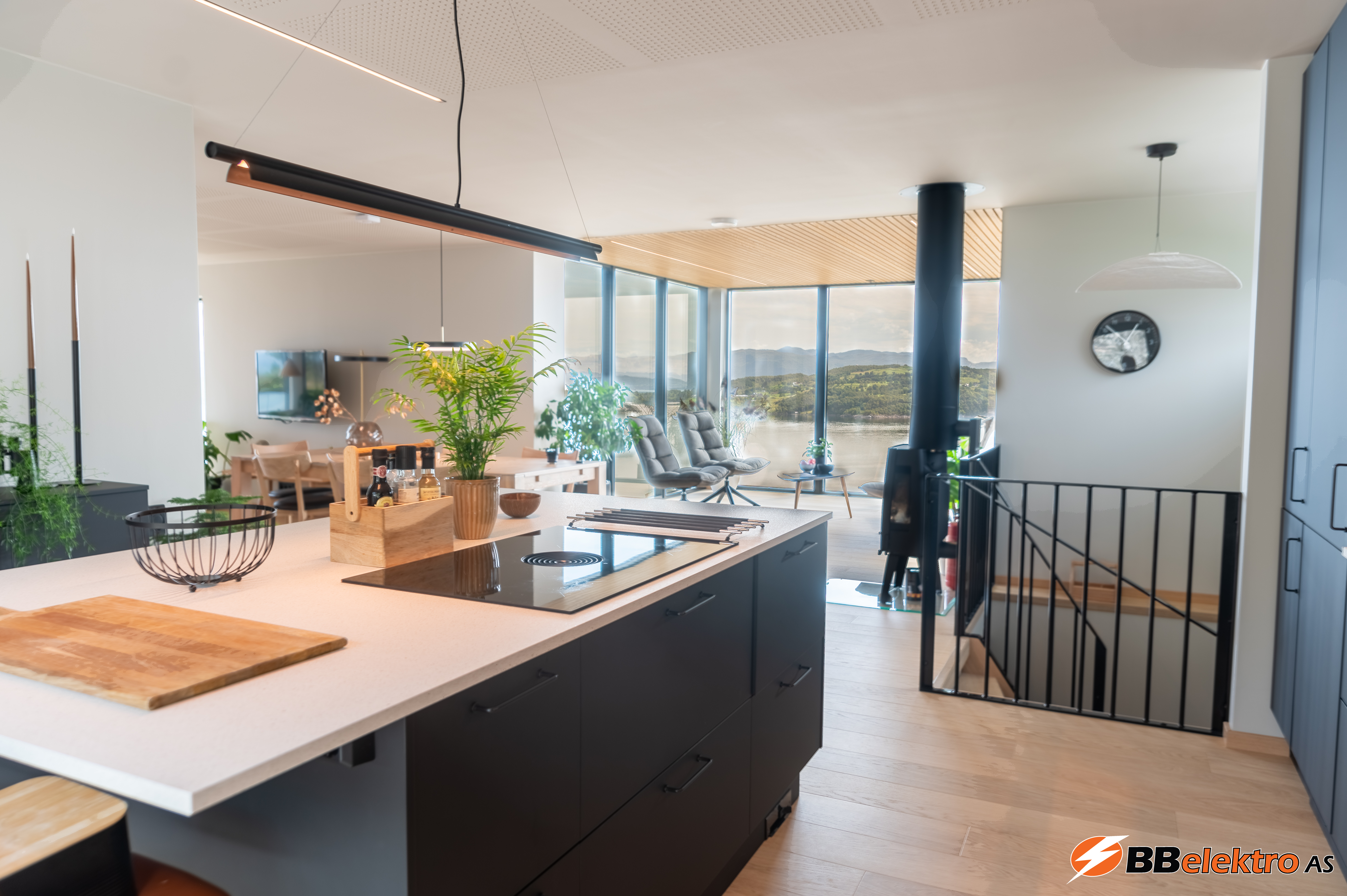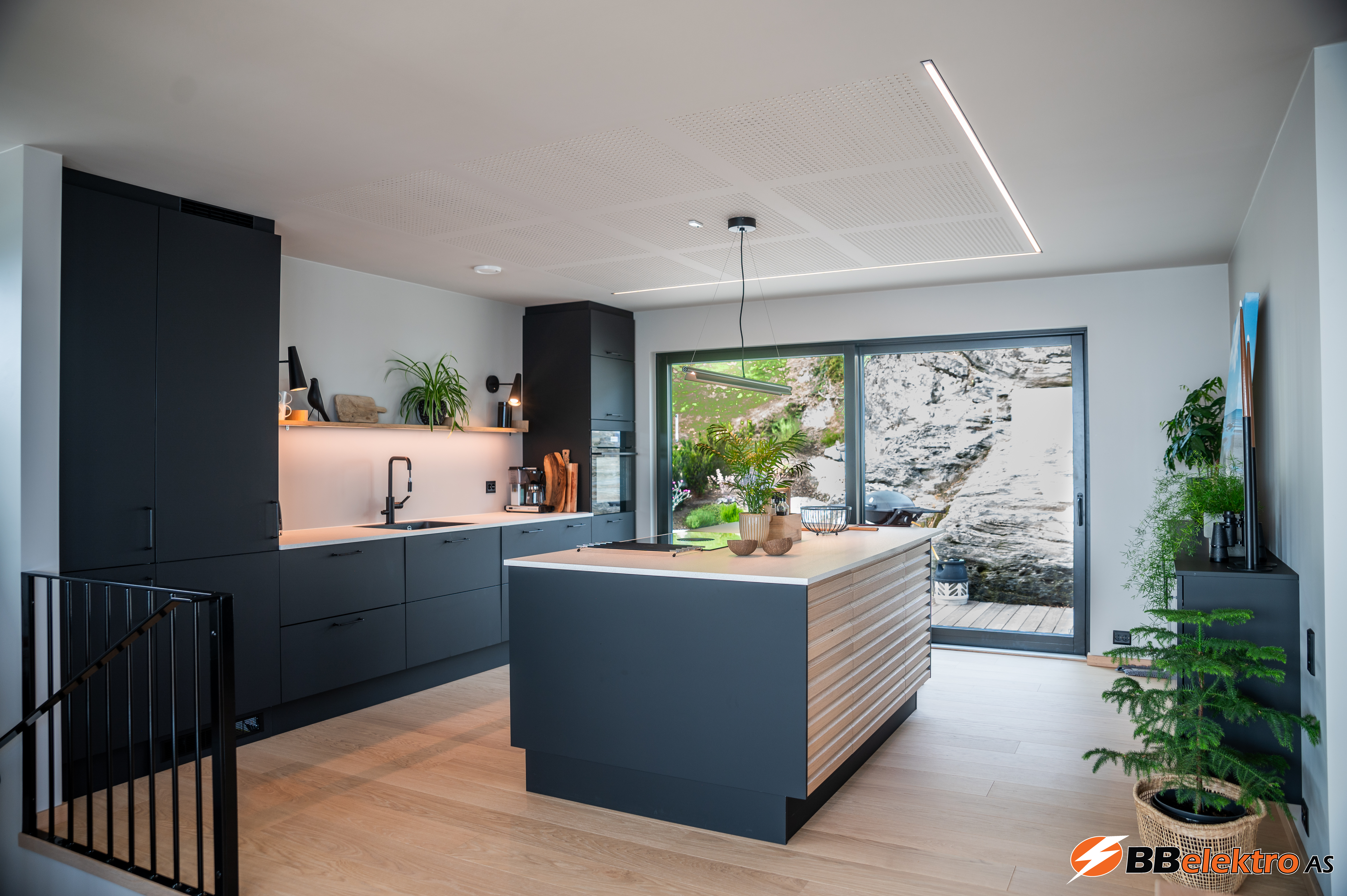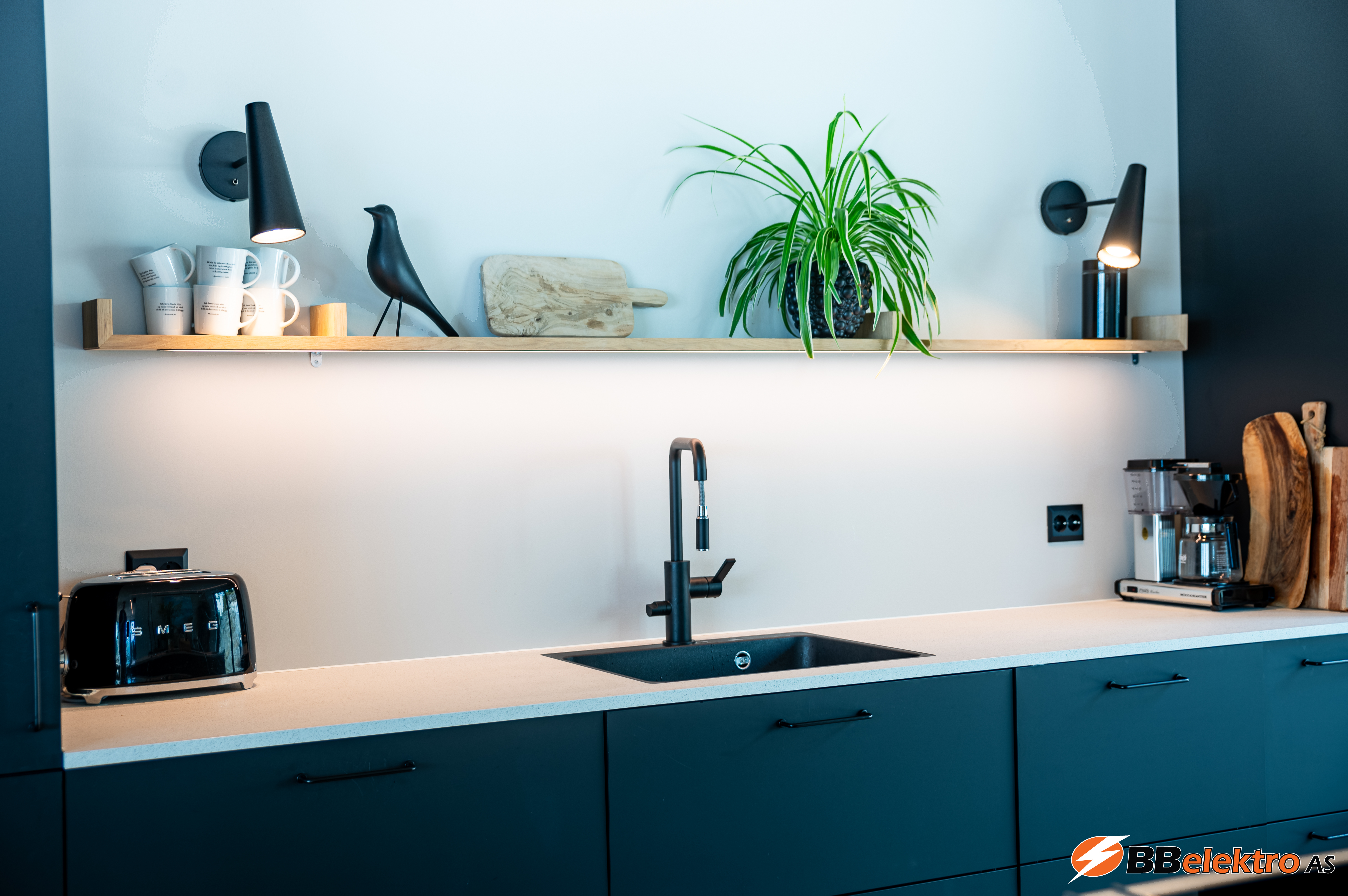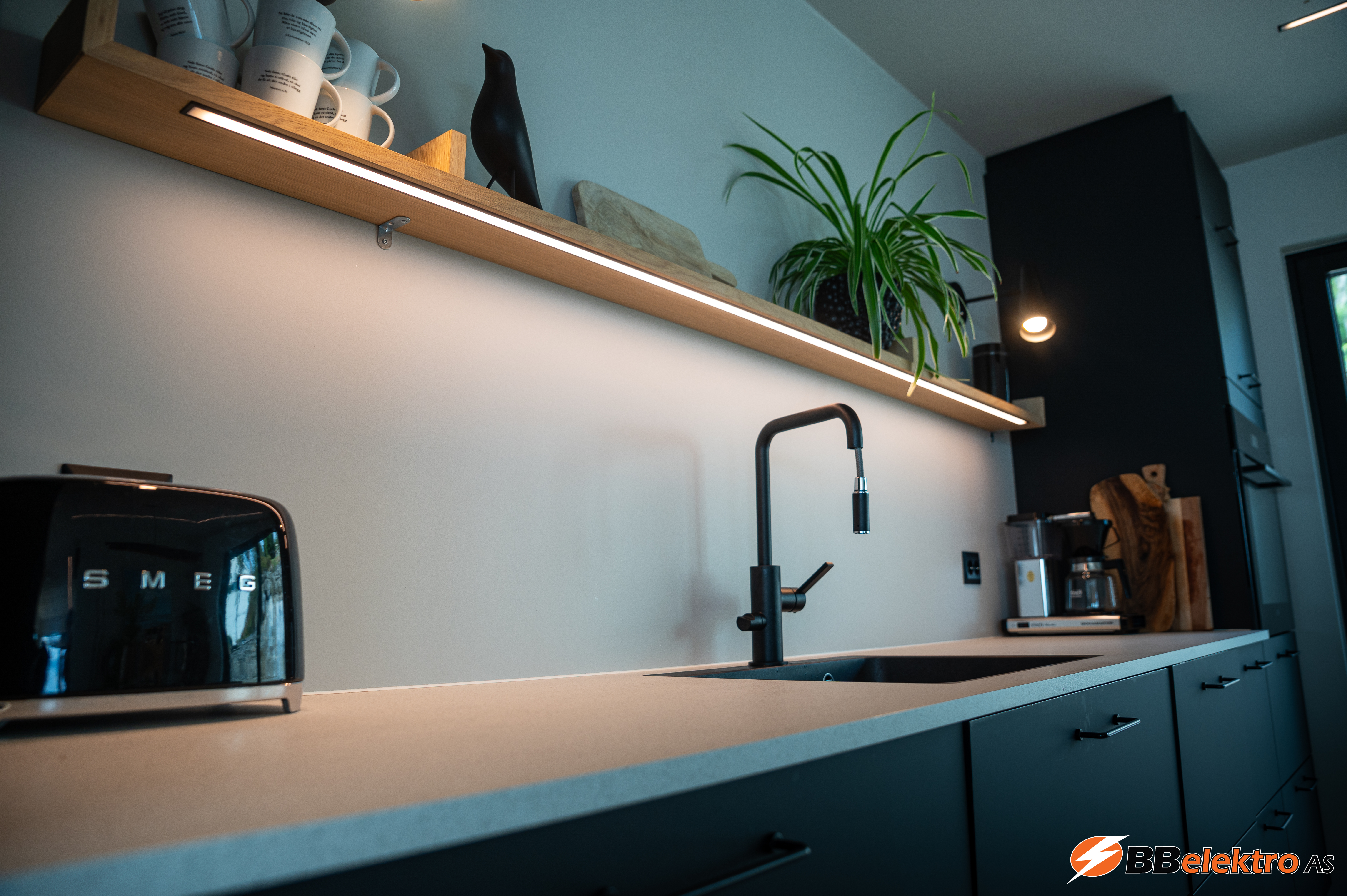 Flott kjøkkenbenk med ledlist i hylle, lyspunkter og svarte stikkontakter.