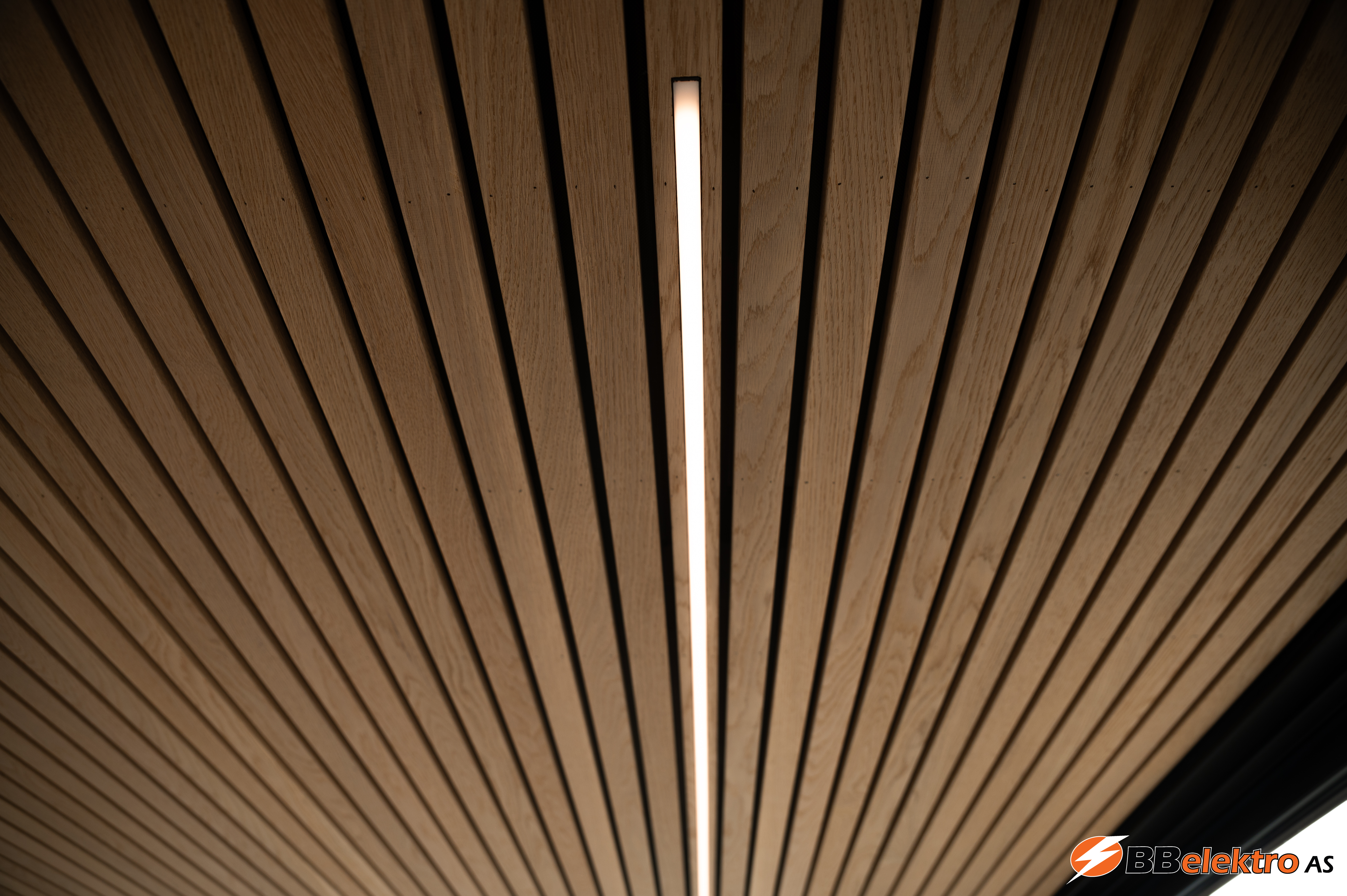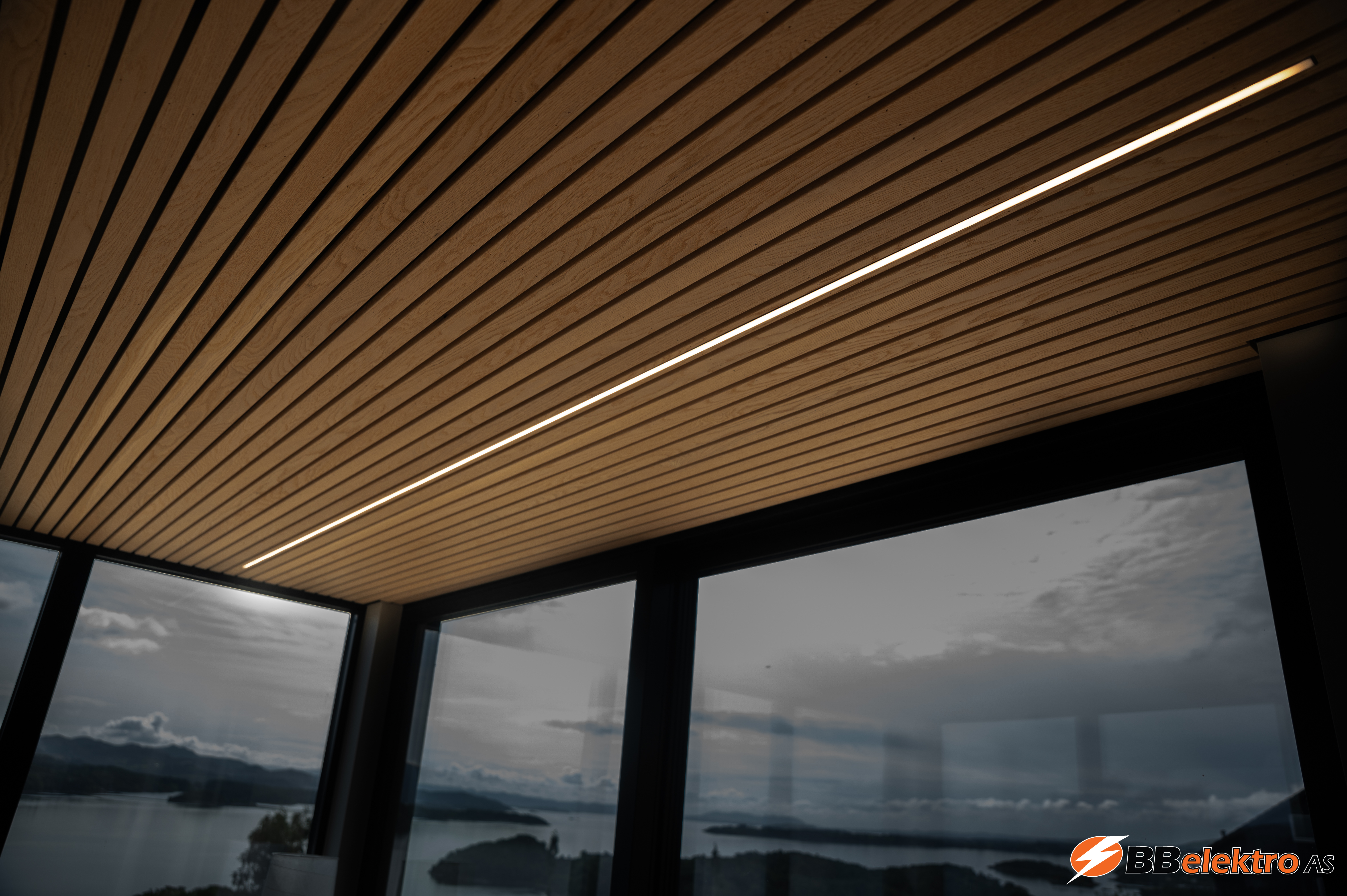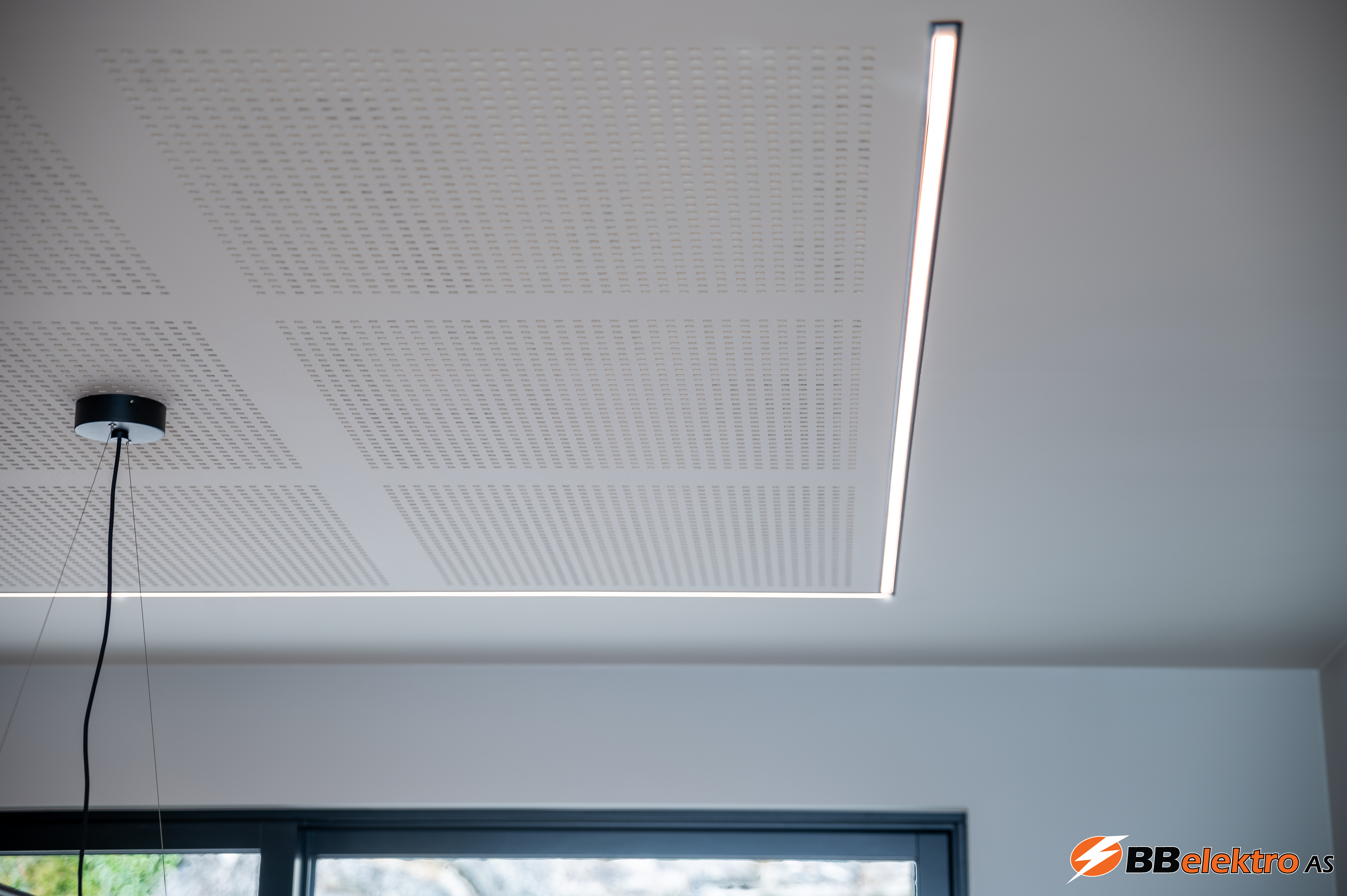 Ledlist i tak for et moderne preg med pendel lys over kjøkkenøy.